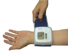 确保手掌朝上,保持血压计于心脏的高度。压脉袋的底部应高于手腕关节约1-2公分。